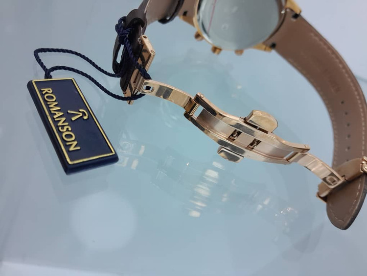 برند رمانسون، سه موتوره، موتور بای ، کرنوگراف، صفر کن، دارای تقویم روز شمار، یکسال گارانتی شرکتی، بند چرمی، رنگ بند قهوه ای، فریم طلایی، صفحه سفید،