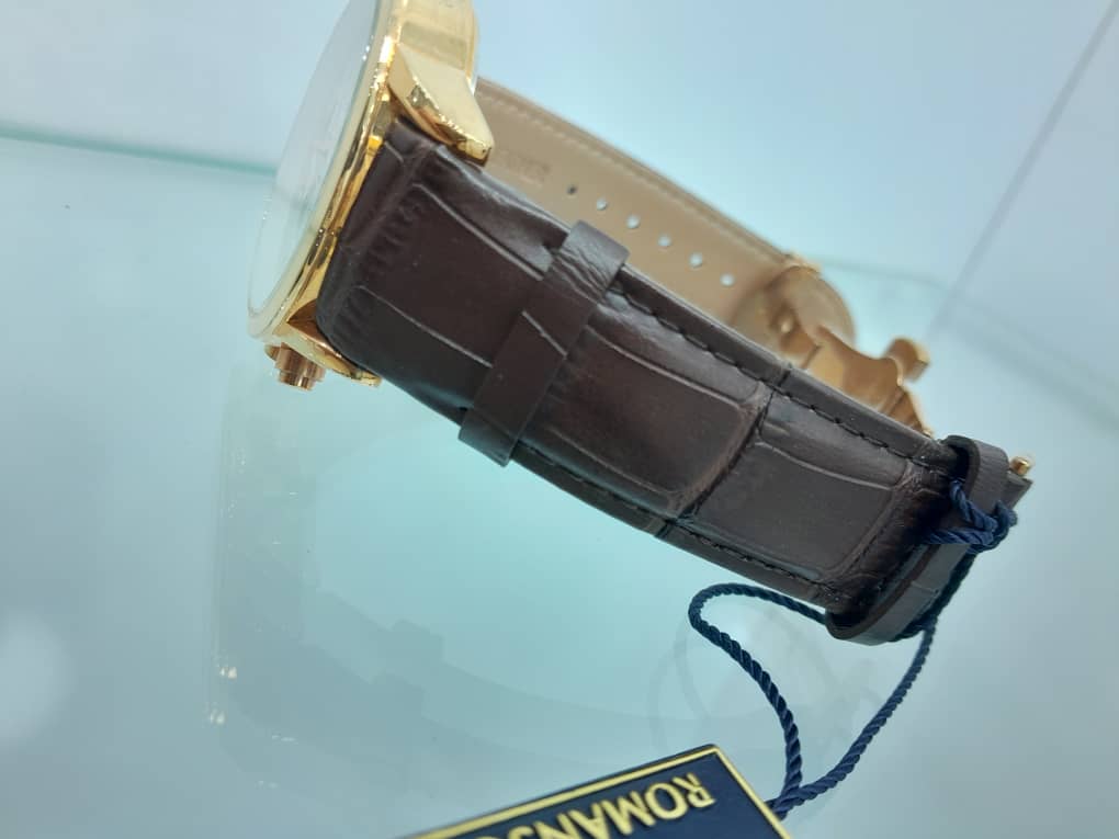 برند رمانسون مردانه، موتور بای ژاپن، یکسال گارانتی شرکتی، کرنو گراف، صفر کن، دارای تقویم روز شمار، بند چرمی، رنگ بند قهوه ای، فریم طلایی، صفحه سفید،