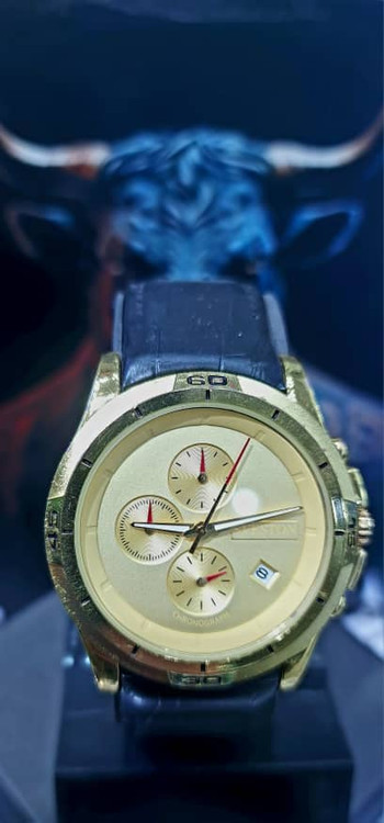 برند سوستون مردانه، سه موتوره، موتور بای ، کرنو گراف، صفر کن، دارای تقویم روز شمار،بند چرمی مشکی، فریم طلایی، صفحه طلایی، یک سال گارانتی موتور،