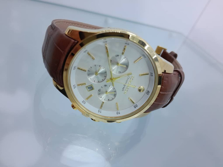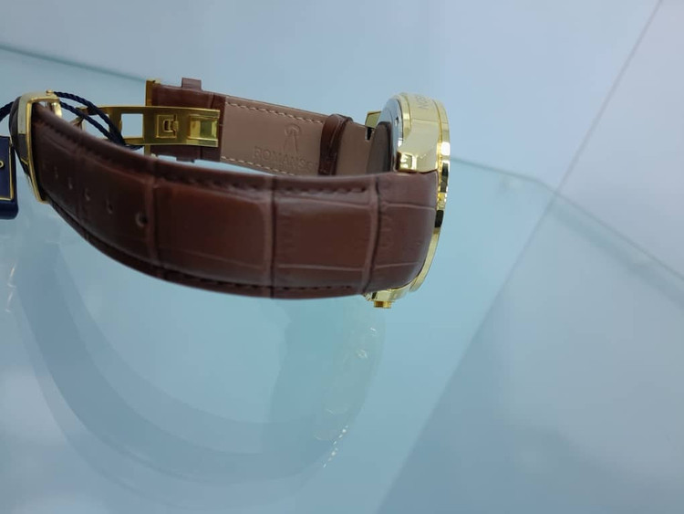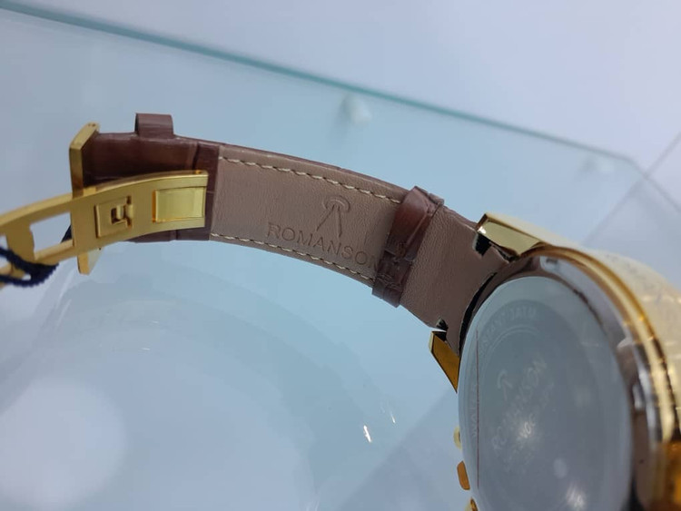 برند رمانسون مردانه، سه موتوره، موتور بای ، کرنو گراف، صفر کن، فول تایم، دارای تقویم روز شمار، یکسال گارانتی موتور، بند چرمی قهوه ای عسلی، فریم طلایی، قفل حرفه ای، صفحه سفید