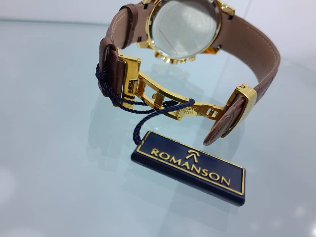 برند رمانسون مردانه، سه موتوره، موتوربای ژاپن، فول تایم، کرنو گراف، صفر کن، دارای تقویم روز شمار، یکسال گارانتی شرکتی، بندچرمی قهوه ای عسلی، فریم طلایی، صفحه سفید، قفل حرفه ای